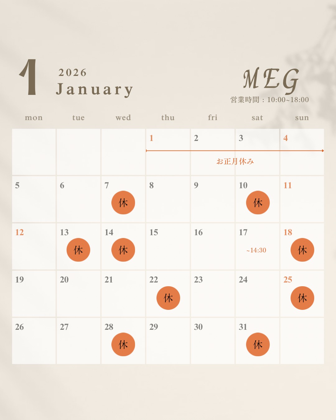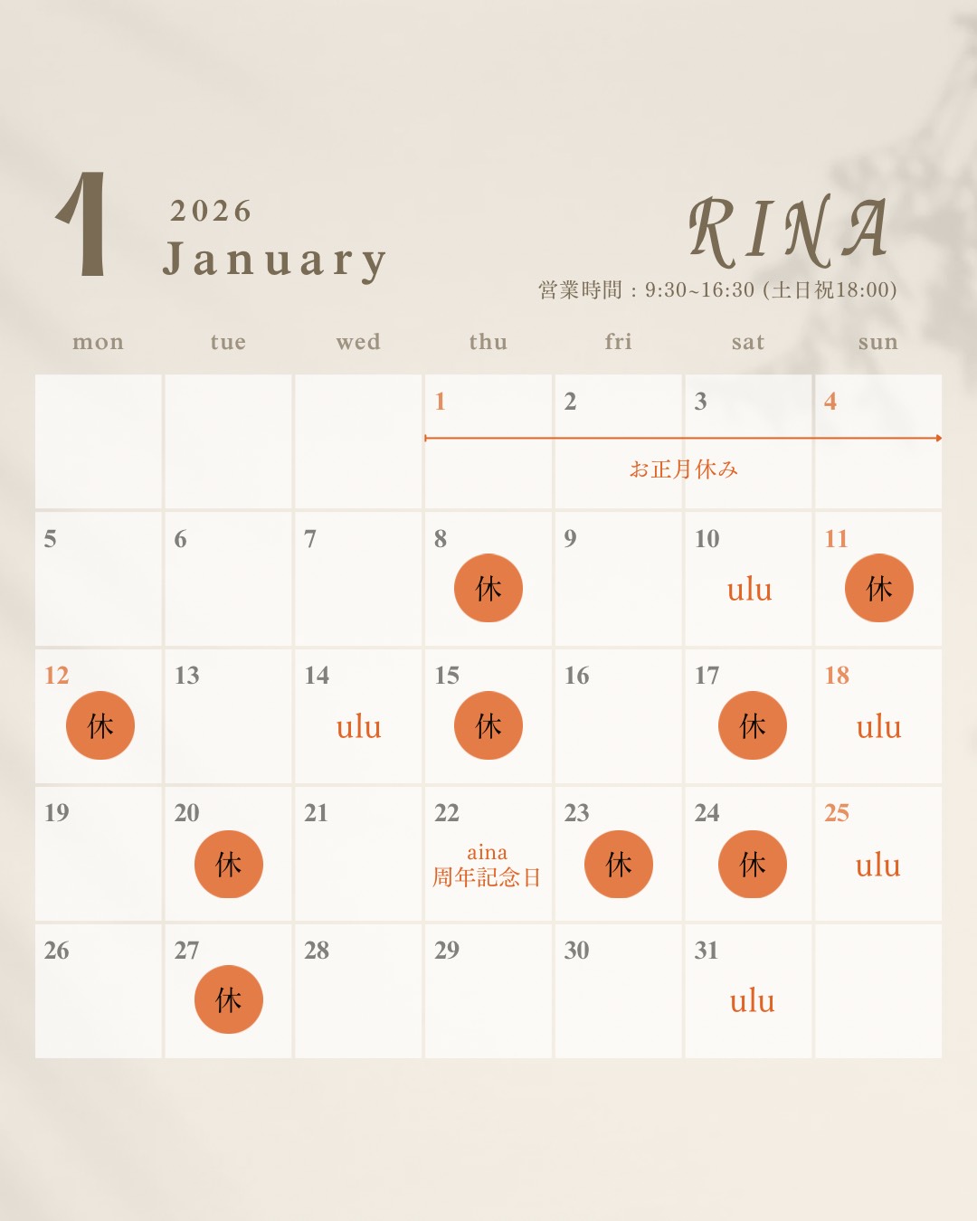 2026年1月出勤日のお知らせ